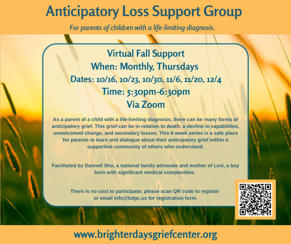 Teen Fall Self-Care Workshop Enjoy cider and treats while finding healthy and mindful ways for self-care while grieving. Date: Tuesday, October 7th, 2025 Time: 6:30-8:00 p.m. Location: Brighter Days Grief […] ![]() ![]() Brighter Days Family Grief Center offers this group for women who have experienced the death of their spouse or partner. There is no cost to participate, however, registration is required. […] ![]() ![]() Sibling Loss Support Group For adults who have experienced the death of a sibling. Date: Tuesdays, October 7-November 11 Time: 7:00-8:00p.m. Location: Virtual via Zoom Registration: https://form.jotform.com/221534390807152 Questions: Email info@bdgc.us |