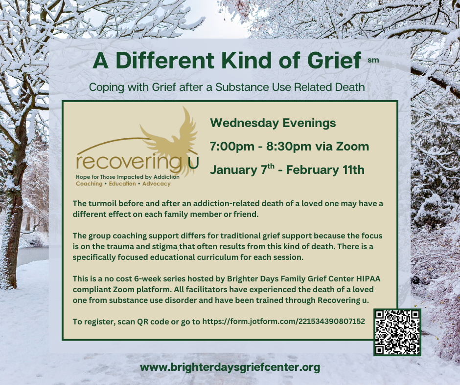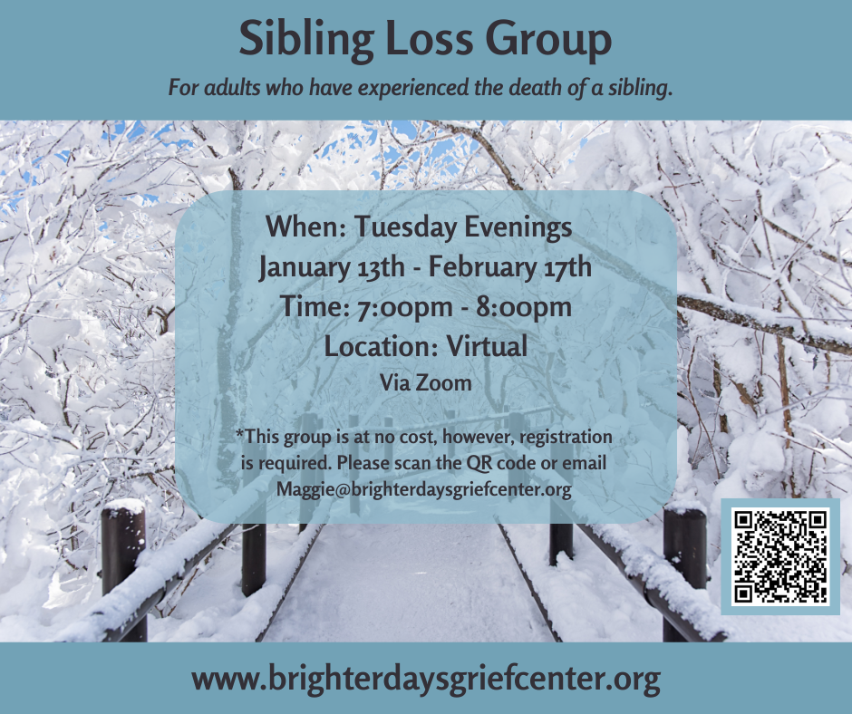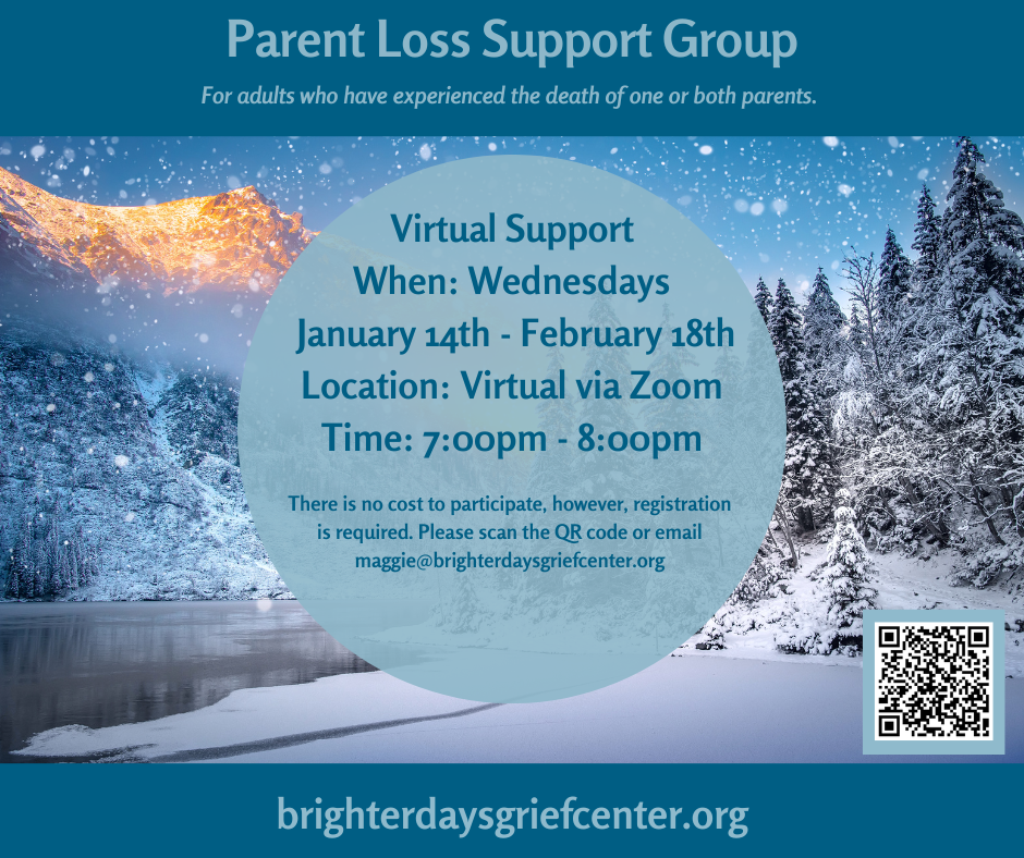 VirtualGrandparent Support Group For grandparents who have experienced the loss of a grandchild. Date: First Wednesday of the Month Time: 10:00 - 11:00 a.m. Location: Virtual via Zoom Registration: Register here: https://form.jotform.com/221534390807152 or email info@bdgc.us Questions: Email Maggie at maggie@brighterdaysgriefcenter.org