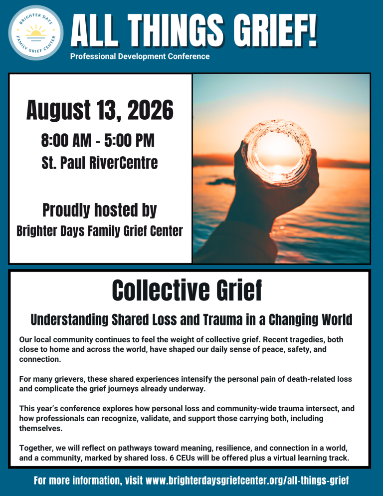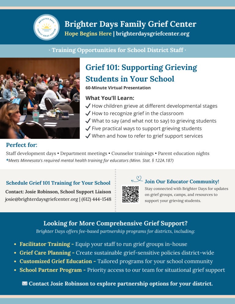 Brighter Days offers many opportunities to collect continuing education credits while learning how to support grieving students and colleagues. Our summer conference offers up to 6 CEUs.